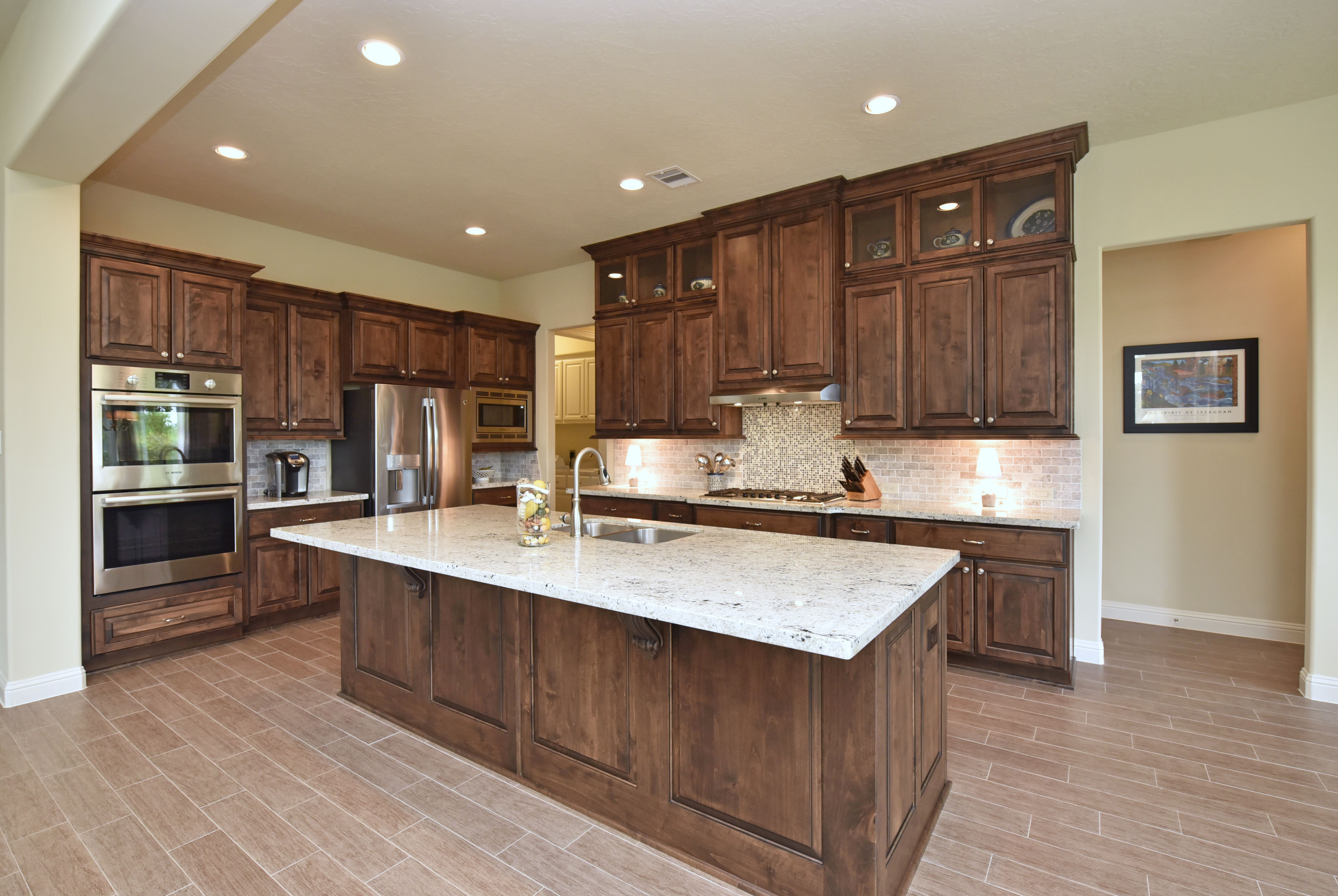 What a spectacular opportunity to own this gorgeous custom 1 story Jaeger home featuring stone and stucco elevation on an 80 ft. wide water lot! From front to back this home beckons those with discriminating taste with wood look tile floors, arched doorways, upgraded kitchen cabinets to ceiling, stainless steel Bosch appliances and granite throughout. Unobstructed views of the water from master, family room, kitchen and breakfast nook. Two en suite bedroom/baths. Upstairs is an unfinished space – perfect for a media/game room area. Three car garage, covered patio and your own bulkhead. Public boat dock across the canal is available for overnight docking. This community is an over 55 Active Adult neighborhood with low maintenance for carefree living.